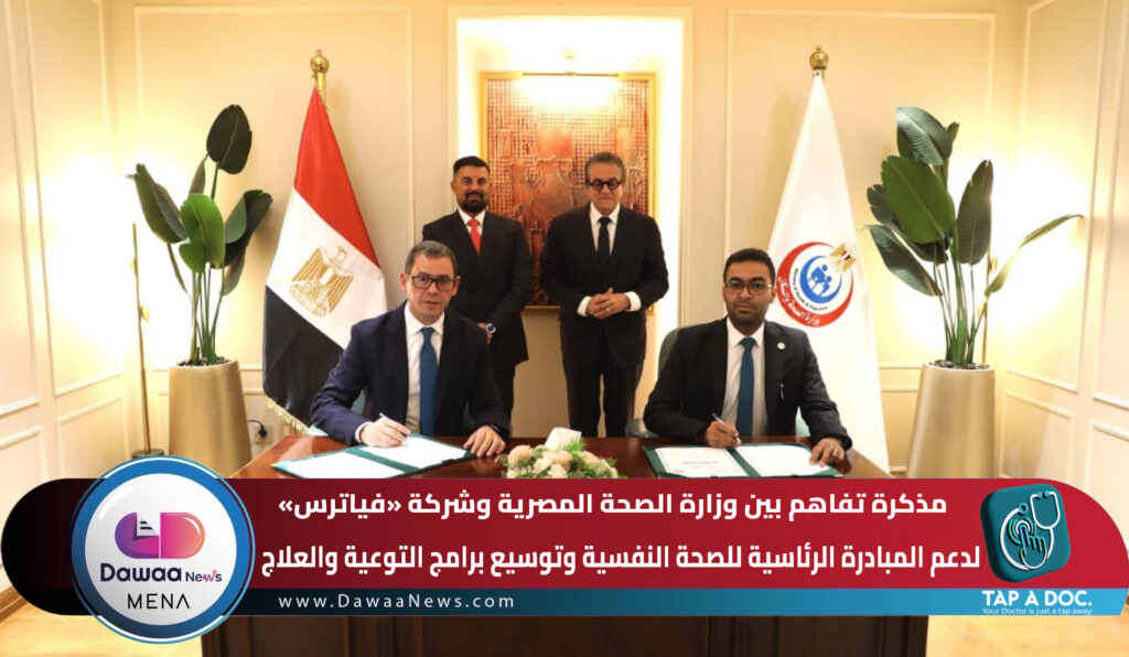 شهد الدكتور خالد عبدالغفار، نائب رئيس مجلس الوزراء وزير الصحة والسكان، مراسم توقيع مذكرة تفاهم جديدة بين الوزارة وشركة «فياترس» للصناعات الدوائية، بهدف تعزيز الجهود الوطنية في مجال الصحة النفسية ودعم المبادرة الرئاسية للصحة النفسية، في إطار التوسع في برامج الوقاية والتشخيص المبكر والعلاج على مستوى الجمهورية.